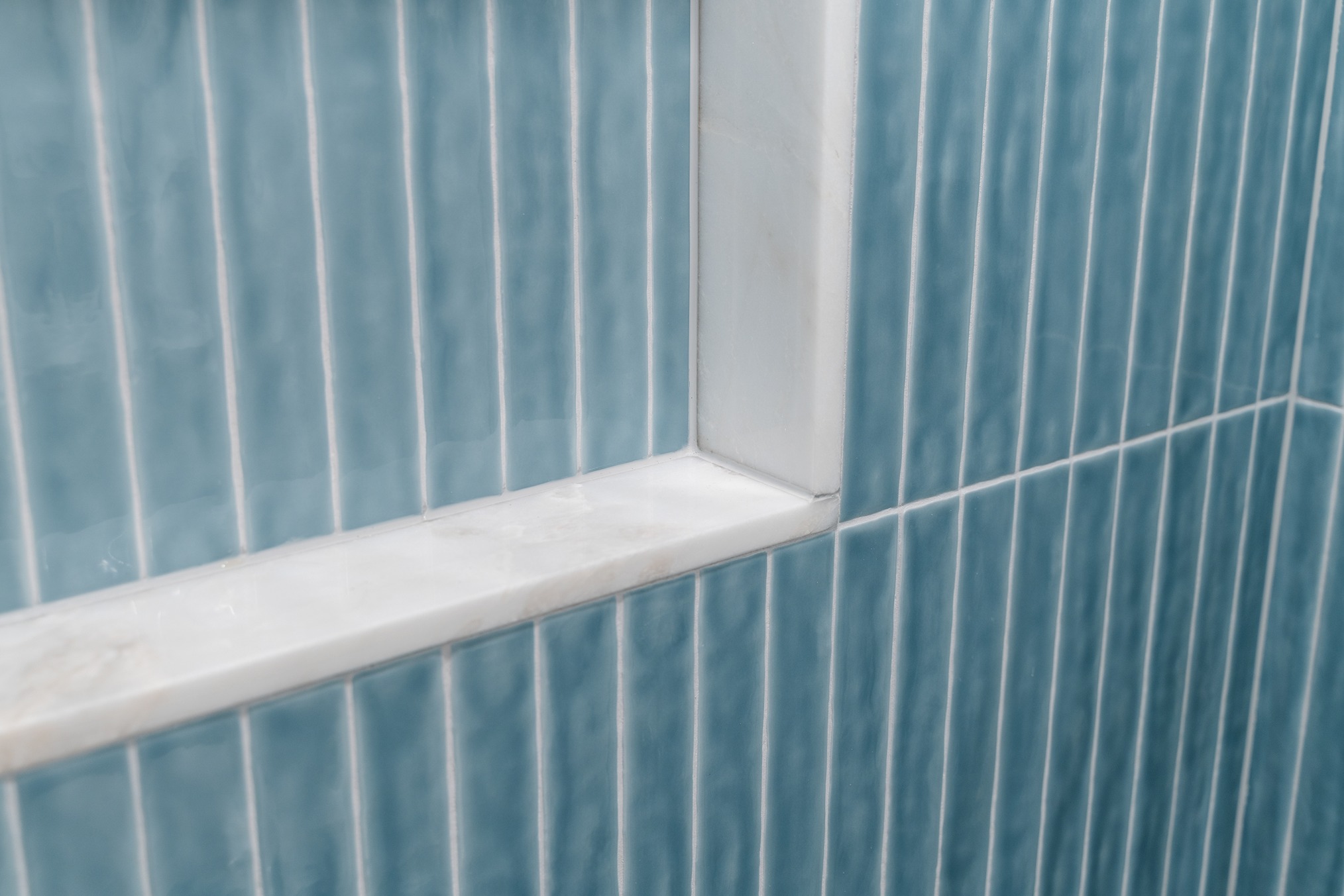 Next, we set the frameless glass shower, laid the blue tile, built a storage niche, and installed the vanity with its hardware. Every fitting was tested, seals checked, and pipes inspected. After a quick cleanup, we handed over an open, functional bathroom right on time and within budget—and the clients couldn’t have been happier with the result.